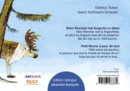 Edition bilingue alsacien-français du premier tome de la collection des Petits polaires. / Petit Renne a peur de tout Petit renne est peureux, si peureux que tout le monde se moque de lui ! Jusqu’au jour où arrive le loup... / Klein Renntiar hät Àngscht vo àllem Klein Renntiar ìsch à Àngschthàs. Ar hät a so Àngscht dàss àlli nà üsslàcha ! Bis àm Dàj wo d’r Wolf kommt…