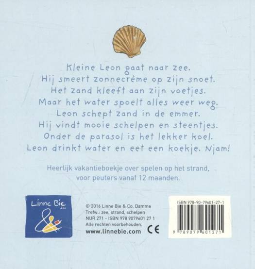 Kleine Leon gaat naar zee. Hij smeert zonnecrème op zijn snoet. Het zand kleeft aan zijn voetjes. Maar het water spoelt alles weer weg. Leon schept zand in de emmer. Hij vindt mooie schelpen en steentjes. Onder de parasol is het lekker koel. Leon drinkt water en eet een koekje. Njam! Heerlijk vakantieboekje over spelen op het strand!