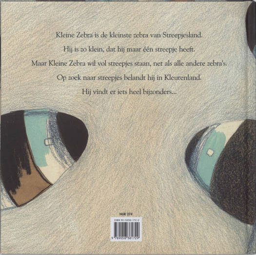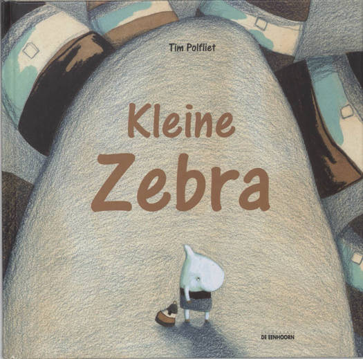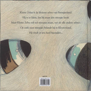 Kleine Zebra Tim Pofliet Kleine Zebra is de kleinste van alle zebra's in Streepjesland. Hij is zo klein dat hij maar één streepje heeft. Voor meer is er geen plaats. De andere zebra's lachen hem uit. "Je ziet zo wit," roepen ze. "Heb je het niet koud?" vragen ze. Op een dag heeft Kleine Zebra er genoeg van. Hij hangt een streepjestas op zijn rug en gaat ervandoor. Nog nooit heeft een zebra zich voorbij de zwart-witte poorten van Streepjesland gewaagd. Kleine Zebra duwt zo hard hij kan tegen de zware poort... Achter de poort ligt Kleurenland. Kleine Zebra maakt er onder meer kennis met een blauwe pianoman en een koninklijke koeientram. Allemaal willen zij hem een streepje geven. Maar Kleine Zebra is op zoek naar een bijzonder streepje...
