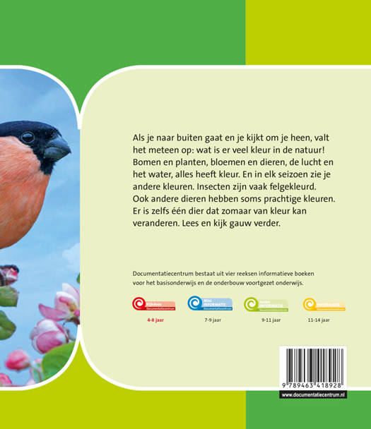 Als je naar buiten gaat en je kijkt om je heen, valt het meteen op: wat is er veel kleur in de natuur! Bomen en planten, bloemen en dieren, de lucht en het water, alles heeft kleur. En in elk seizoen zie je andere kleuren. Insecten zijn vaak felgekleurd. Ook andere dieren hebben soms prachtige kleuren. Er is zelfs één dier dat zomaar van kleur kan veranderen. Lees en kijk gauw verder.