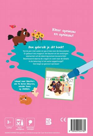 Fan van paarden en pony's? Vul de pen met water en ga ermee over de kleurplaten. Er gebeurt iets magisch: de kleuren en de verborgen elementen uit de tekening komen tevoorschijn! Zo kun je alle vraagjes beantwoorden. Is het water opgedroogd? Dan begin je gewoon opnieuw! Ideaal voor kleuters om te leren kleuren, zonder kans op vlekken.