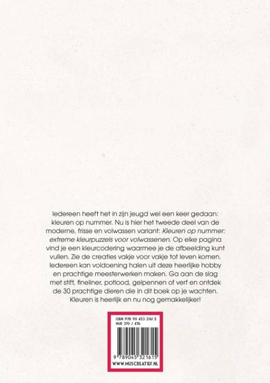 Iedereen heeft het in zijn jeugd wel een keer gedaan: kleuren op nummer. Nu is hier de moderne, frisse en volwassen variant: Kleuren op nummer deel 2. Ontspan en laat je creativiteit de vrije loop terwijl je je puzzel- en kleurskills naar een hoger niveau tilt! Op elke pagina vind je de kleurcodering waarmee je de afbeelding kunt vullen. Zie de creaties vakje voor vakje tot leven komen. Ga aan de slag met stift, fineliner, potlood, gelpennen of verf: in dit boek wachten 30 prachtige dieren tot jij ze ontdekt.