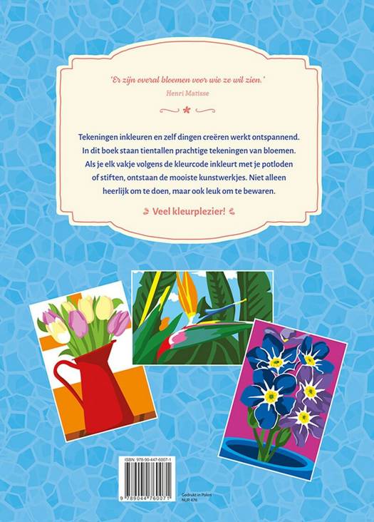 Tekeningen inkleuren en zelf dingen creëren werkt ontspannend. In dit boek staan tientallen prachtige tekeningen van bloemen. Als je elk vakje volgens de kleurcode inkleurt met je potloden of stiften, ontstaan de mooiste kunstwerkjes. Niet alleen heerlijk om te doen, maar ook leuk om te bewaren. Veel kleurplezier!