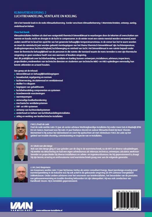 Klimaatinstallaties hebben als doel een vastgesteld thermisch binnenklimaat te waarborgen door de tekorten of overschotten aan warmte en koude, vocht en droogte in de lucht te compenseren. In de winter moet een ruimte meestal worden verwarmd, want anders wordt het te koud ten opzichte van het gewenste behaaglijke temperatuursniveau. In de zomer kan het te warm worden en moet de ruimtelucht juist worden gekoeld. Kernbegrippen van het thema 'thermisch binnenklimaat' zijn: luchttemperatuur,stralingstemperatuur, luchtvochtigheid, luchtbeweging en reinheid van lucht. Het binnenklimaat in een ruimte bepaalt onder meer de thermische behaaglijkheid van de personen in die ruimte: die toestand waarin de mens tevreden is over zijn thermische omgeving en geen voorkeur heeft voor een warmere of koudere omgeving. Met dit praktijkboek over luchtbehandeling, ventilatie en koeling kunnen ontwerpers, installateurs, adviseurs, inspecteurs, projectleiders, medewerkers van technische diensten en studenten aan technische MBO- en HBO-opleidingen eenvoudig hun kennis uitbreiden en actueel houden. Een greep uit de inhoud: binnenklimaat en behaaglijkheidsbegrippen bouwbesluit, regelgeving en normen luchtverversing, circulatievoud en ventilatievoud Mollier h-x-diagram begrippen van geluidtheorie luchtbehandeling componenten en systemen brandwerende voorzieningen warmtepompen eenvoudige koellastberekening mechanische ventilatiesystemen VRF- en VRV-systemen ontwerp van luchtverdeelsystemen onderhoud en beheer van luchtbehandelingsinstallaties uitleg en werking van koeltechnische installaties