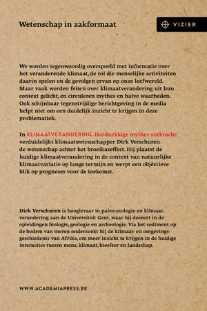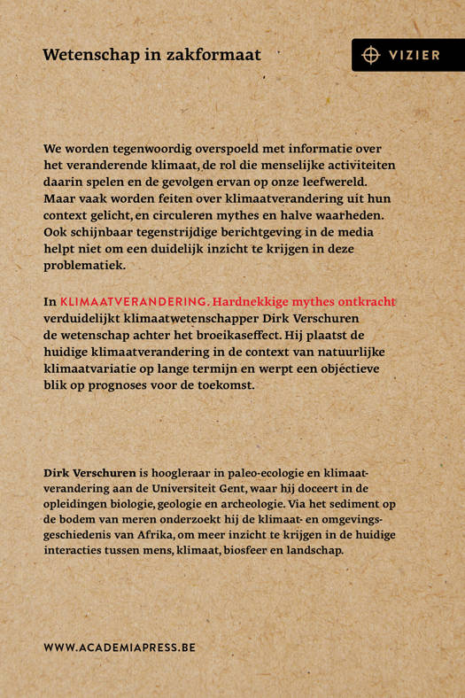 In Klimaatverandering. Hardnekkige mythes ontkracht verduidelijkt klimaatwetenschapper Dirk Verschuren de wetenschap achter het broeikaseffect. Hij plaatst de huidige klimaatverandering in de contect van natuurlijke klimaatvariatie op lange termijn en werpt een objectieve blik op prognoses voor de toekomst.