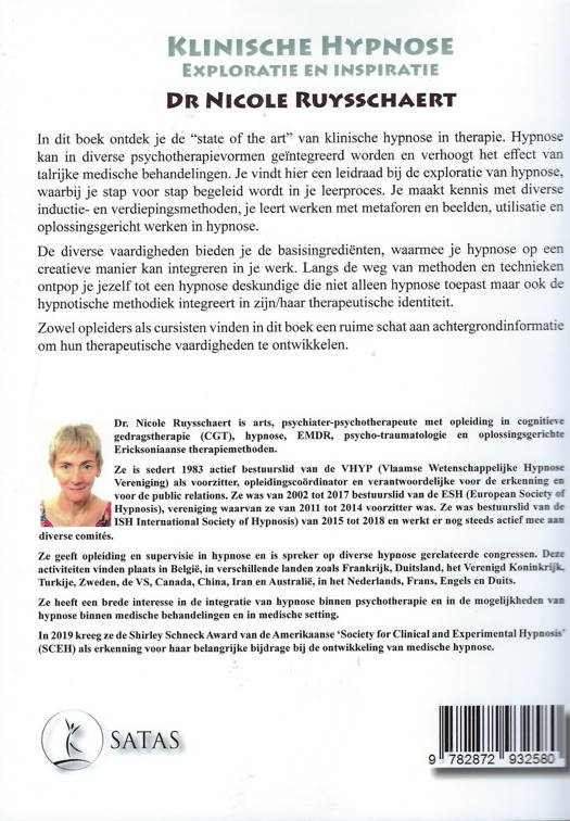 In dit boek ontdek je de “state of the art” van klinische hypnose in therapie. Hypnose kan in diverse psychotherapievormen geïntegreerd worden en verhoogt het effect van talrijke medische behandelingen. Je vindt hier een leidraad bij de exploratie van hypnose, waarbij je stap voor stap begeleid wordt in je leerproces. Je maakt kennis met diverse inductie- en verdiepingsmethoden, werken met metaforen en beelden, utilisatie en oplossingsgericht werken in hypnose. De diverse vaardigheden bieden je de basisingrediënten, waarmee je hypnose op een creatieve manier kan integreren in je werk. Langs de weg van methoden en technieken ontpop je jezelf tot een hypnose deskundige die niet alleen hypnose toepast maar ook de hypnotische methodiek integreert in zijn/haar therapeutische identiteit. Zowel opleiders als cursisten vinden in dit boek een ruime schat aan achtergrondinformatie om hun therapeutische vaardigheden te ontwikkelen. Dr. Nicole Ruysschaert is arts, psychiater-psychotherapeute met opleiding in cognitieve gedragstherapie (CGT), hypnose, EMDR, psycho-traumatologie en oplossingsgerichte therapiemethoden. Ze was jarenlang werkzaam in centra geestelijke gezondheidszorg en heeft sinds 35 jaar een private praktijk in Antwerpen.In 2019 kreeg ze de Shirley Schneck Award van de Amerikaanse ‘“Society for Clinical and Experimental Hypnosis’” (SCEH) als erkenning voor haar belangrijke bijdrage bij de ontwikkeling van medische hypnose.