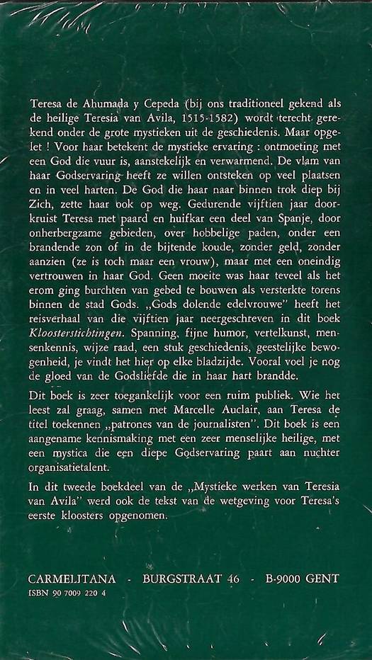 Voor Teresia van Avila betekent de mystieke ervaring: ontmoeting met God die vuur is, aanstekelijk en verwarrend. De vlam van haar Godservaring heeft ze willen ontsteken op veel plaatsen en in veel harten. De God die haar naar binnen trok diep bij Zich, zette haar ook op weg. Gedurende vijftien jaar doorkruist Teresa met paard en huifkar een deel van Spanje, door onherbergzame gebieden, over hobbelige paden, onder een brandende zon of in de bijtende koude, zonder geld, zonder aanzien (ze is trouwens maar een vrouw), maar met een oneindig vertrouwen in haar God. Geen moeite was haar teveel als het erom ging burchten van gebed te bouwen als versterkte torens binnen de stad Gods. Spanning, fijne humor, vertelkunst, mensenkennis, wijze raad, een stuk geschiedenis, geestelijke bewogenheid, je vindt het hier op elke bladzijde. Vooral voel je nog de gloed van de Godsliefde die in haar hart brandde. Dit boek is zeer toegankelijk voor een ruim publiek. Het is een aangename kennismaking met een zeer menselijke heilige, met een mystica die een diepe Godservaring paart aan nuchter organisatietalent.