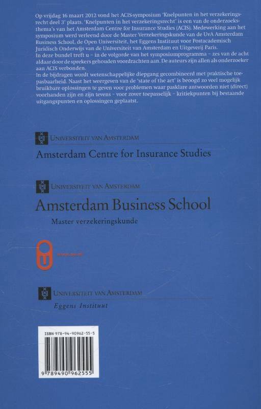 Op vrijdag 16 maart 2012 vond het ACIS-symposium ‘Knelpunten in het verzekeringsrecht deel 3’ plaats. ‘Knelpunten in het verzekeringsrecht’ is een van de onderzoeksthema’s van het Amsterdam Centre for Insurance Studies (ACIS). Medewerking aan het symposium werd verleend door de Master Verzekeringskunde van de UvA Amsterdam Business School, de Open Universiteit, het Eggens Instituut voor Postacademisch Juridisch Onderwijs van de Universiteit van Amsterdam en Uitgeverij Paris.