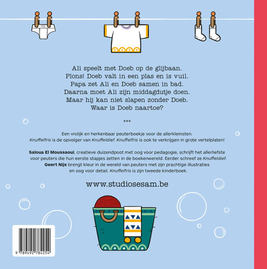 Ali speelt met Doeb op de glijbaan. Doeb valt in een plas en is vuil. Papa zet Ali en Doeb samen in bad. Daarna moet Ali een middagdutje doen, maar hij gaat op zoek naar Doeb. Een vrolijk, kleurrijk en herkenbaar prentenboek voor de allerkleinste peuters! ‘Knuffelfris’ is de prachtige opvolger van ‘Knuffeldief’. Saloua El Moussaoui, creatieve duizendpoot met oog voor pedagogie, schrijft het allerliefste voor peuters die hun eerste stapjes zetten in de boekenwereld. In Antwerpen runt ze een pop-up winkel Fab Store voor lokale handelaars en werkt voor de stad. Geert Nijs is een illustrator die zich vooral uit met zijn (digitale) potlood. Met prachtige illustraties en oog voor detail brengt hij kleur in de wereld van peuters. Hij woont en werkt in de provincie Limburg in België. ‘Knuffelfris’ is hun tweede kinderboek! Knuffelfris is een herkenbaar & vrolijk peuterboekje voor de allerkleinsten.