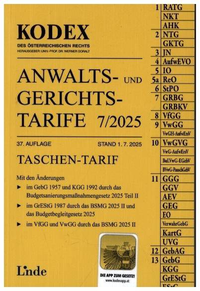 Mit den Änderungen: - im GebG 1957 und KGG 1992 (neue Tarife ab 1. 7. 2025) durch das Budgetsanierungsmaßnahmengesetz 2025 Teil II (BMSG 2025 II) - im GrEStG 1987 durch das BSMG 2025 II und das Budgetbegleitgesetz 2025 (BBG 2025) - im VfGG und VwGG (neue Gebührensätze ab 1. 7. 2025) durch das BSMG 2025 I