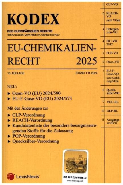 Der Kodex EU-Chemikalienrecht 16. Auflage mit Stand 1. 11. 2024 enthält:NEU:Ozon-VO (EU) 2024/590