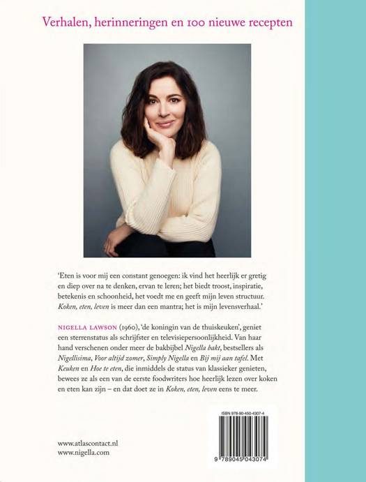 ‘Koken, eten, leven’ is het nieuwste boek van Nigella Lawson. Lawson geniet een sterrenstatus als schrijfster en televisiepersoonlijkheid. Van haar hand verschenen onder meer de bakbijbel ‘Nigella bakt’, bestsellers als ‘Nigellisima’, ‘Voor altijd zomer’, ‘Simply Nigella’ en ‘Bij mij aan tafel’. ‘Eten is voor mij een constant genoegen: ik vind het heerlijk er gretig en diep over na te denken, ervan te leren; het biedt troost, inspiratie, betekenis en schoonheid, het voedt me en geeft mijn leven structuur. ‘Koken, eten, leven’ is meer dan een mantra; het is mijn levensverhaal.' Met haar eerdere werk bewees ze als een van de eerste foodwriters hoe heerlijk lezen over koken en eten kan zijn – en dat doet ze in ‘Koken, eten, leven’ eens te meer.