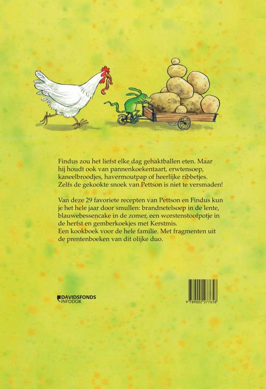 Findus zou het liefst elke dag gehaktballen eten. Maar hij houdt ook van pannenkoekentaart, erwtensoep, kaneelbroodjes, havermoutpap of heerlijke ribbetjes. Van deze 29 favoriete recepten van Pettson en Findus kun je het hele jaar door smullen: brandnetelsoep in de lente, blauwebessencake in de zomer, een worstenstoofpotje in de herfst en gemberkoekjes met Kerstmis. Een kookboek voor de hele familie. Met fragmenten uit de prentenboeken van dit olijke duo.