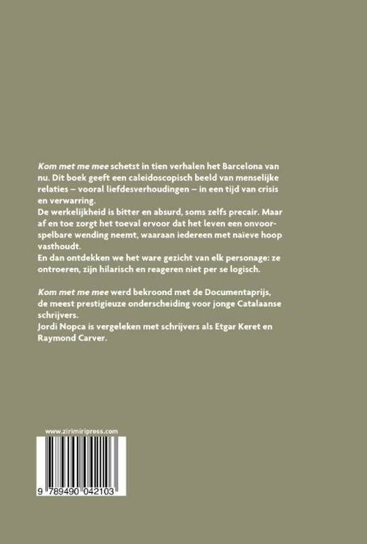 "Kom met me mee" schetst in tien verhalen het Barcelona van nu. Dit boek geeft een caleidoscopisch beeld van menselijke relaties – vooral liefdesverhoudingen – in een tijd van crisis en verwarring. De werkelijkheid is bitter en absurd, soms zelfs precair. Maar af en toe zorgt het toeval ervoor dat het leven een onvoorspelbare wending neemt, waaraan iedereen met naïeve hoop vasthoudt. En dan ontdekken we het ware gezicht van elk personage: ze ontroeren, zijn hilarisch en reageren niet per se logisch. "Kom met me mee" werd bekroond met de Documentaprijs, de meest prestigieuze onderscheiding voor jonge Catalaanse schrijvers. Jordi Nopca is vergeleken met schrijvers als Etgar Keret en Raymond Carver. Vertaald uit het Catalaans door Pieter Lamberts
