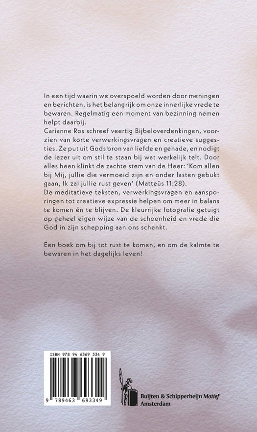 De meditatieve teksten, verwerkingsvragen en aansporingen tot creatieve expressie helpen om meer in balans te komen én te blijven. De kleurrijke fotografie getuigt op geheel eigen wijze van de schoonheid en vrede die God in zijn schepping aan ons schenkt.