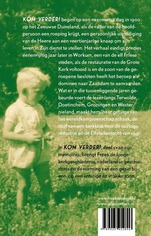 'Kom verder!' van Freek de Jonge begint op een nazomerse dag in 1900 op het Zeeuwse Duiveland, als de vader van de hoofdpersoon een roeping krijgt, een persoonlijke uitnodiging van de Heere aan een veertienjarige knaap om zijn leven in Zijn dienst te stellen. Het verhaal eindigt precies eenenvijftig jaar later in Workum, een van de elf Friese steden, als de restauratie van de Grote Kerk voltooid is en de zoon van de geroepene besloten heeft het beroep als dominee naar Zaandam te aanvaarden. Wat er in die tussenliggende jaren gebeurde voert de lezer langs Terwolde, Doetinchem, Groningen en Westernieland, maakt hem/haar getuige van het wereldkampioenschap schaak, de roof van een kerkklok voor de oorlogsindustrie en de Elfstedentocht van 1947. Kom verder! vormt deel 1 van zijn memoires. Deel 1 – het Zaanseche Veem en ander verhalen (titel Reikhalzend verlangen) verscheen oktober 2017 Deel 3 – in Zeeland, verschijningsdatum nog niet bekend Deel 4 – in Amsterdam, verschijningdatum nog niet bekend