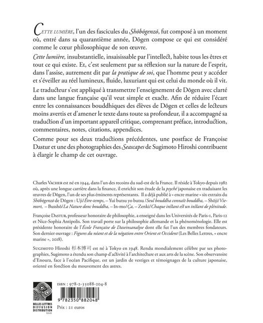 Cette lumière est l’un des fascicules de l’œuvre maîtresse de Dôgen, le Shôbôgenzô, qui réunit les discours adressés à ses élèves. Entré dans sa quarantième année, il compose ceux qui sont constituent le cœur philosophique de son œuvre. La traduction ici proposée fait suite aux traductions déjà proposées par Charles Vacher, les plus récentes étant Je suis temps et En rêve, dire le rêve. Cette lumière, insaisissable par l’intellect, insubstantielle, immense et indivise, habite tous les êtres, tout ce qui existe. Et, c’est seulement par sa réflexion sur la nature de l’esprit, dans l’exercice de la méditation assise, autrement dit par la pratique de soi, que l’homme peut y accéder et ainsi s’éveiller à la réalité, lumineuse, fluide, luxuriante qui est celle du monde qui l’entoure.