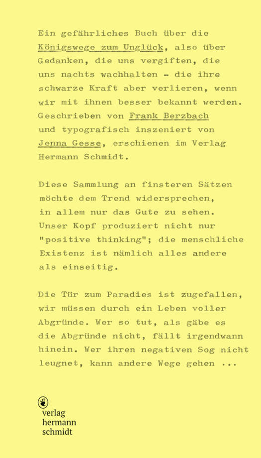 Kennen Sie das? Sie liegen nachts wach und giftige Gedanken ergreifen von Ihnen Besitz. Lassen sich nicht verscheuchen. Werden immer mächtiger, während auf Instagram doch alle um die Wette lächeln. Während die Regale mit Glücksratgebern und Positiver Psychologie überquellen und eine ganze Glücksindustrie boomt. Während es das Leben mit allen um Sie herum doch gut meint.Über diese Nächte spricht man nicht. Über die Sätze, die dem Selbstbewusstsein empfindlich zusetzen, auch nicht. Das passt nicht in eine Welt, die »good vibes only« verlangt. In der aus der Pursuit of Happiness längst ein Zwang zum Glücklichsein geworden ist. Selbst schuld, wer seinen Weg zum Glück nicht findet. Hat nicht hart genug daran gearbeitet. Und versteckt sich besser.Und dann entdecken Sie ein Buch mit 100 Königswegen zum Unglück.Sie erkennen, dass Sie nicht allein sind mit dem einen oder anderen destruktiven Denkmuster. Dass auch in anderen Köpfen Sätze wohnen, die sich unbarmherzig Bahn brechen. Dass wir nicht entscheiden, was wir denken. Dass negative Gedanken kommen, ob wir wollen oder nicht. Dass sie zum Leben gehören. Diese Erkenntnis hilft schon ungemein, aber dieses Buch kann mehr.Indem Frank Berzbach und Jenna Gesse ihre 100 Wege zum Unglück teilen, helfen sie Ihnen, Ihre giftigen Gedanken zu erkennen. Sie ans Licht zu zerren. Abstand zu gewinnen. Zu entscheiden, wie Sie mit ihnen umgehen. Und ihnen damit einen Teil ihrer zerstörerischen Macht zu nehmen.»In Ihrem Kopf entstehen schlimme, negative Sätze, in meinem auch, aber das ist noch kein Unglück. Zum Königsweg ins Unglück werden sie erst, wenn wir sie glauben, uns ihnen hingeben, den Gedanken in unserem Kopf mit der Realität außerhalb verwechseln.«Wenn Ihr Kopf dann das nächste Mal den Weg ins Unglück einschlägt, schauen Sie sich kurz um, aber gehen Sie nicht weiter.