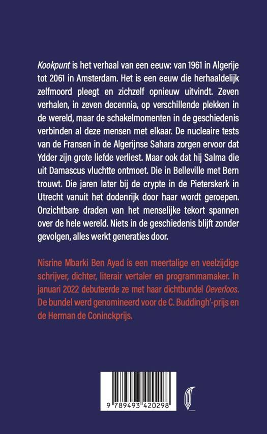 'Kookpunt' is het verhaal van een eeuw: van 1961 in Algerije tot 2061 in Amsterdam. Het is een eeuw die herhaaldelijk zelfmoord pleegt en zichzelf opnieuw uitvindt. Zeven verhalen, in zeven decennia, op verschillende plekken in de wereld, maar de schakelmomenten in de geschiedenis verbinden al deze mensen met elkaar. De nucleaire tests van de Fransen in de Algerijnse Sahara zorgen ervoor dat Ydder zijn grote liefde verliest. Maar ook dat hij Salma die uit Damascus vluchtte ontmoet. Die in Belleville met Bern trouwt. Die jaren later bij de crypte in de Pieterskerk in Utrecht vanuit het dodenrijk door haar wordt geroepen. Onzichtbare draden van het menselijke tekort spannen over de hele wereld. Niets in de geschiedenis blijft zonder gevolgen, alles werkt generaties door.