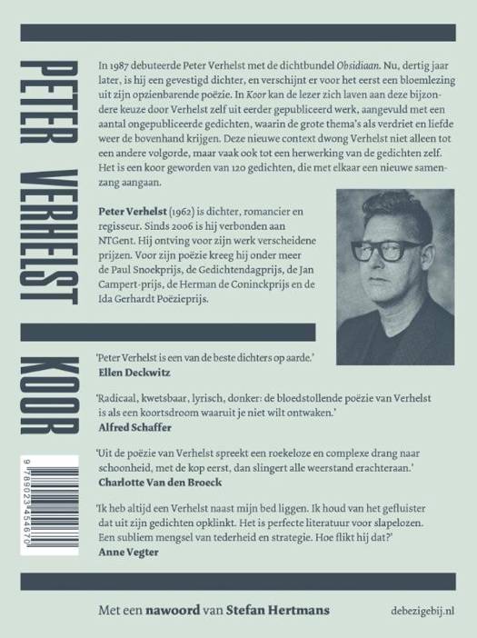 Koor kan de lezer zich laven aan deze bijzondere keuze door Verhelst zelf uit eerder gepubliceerd werk, aangevuld met een aantal ongepubliceerde gedichten, waarin de grote thema’s als verdriet en liefde weer de bovenhand krijgen. Deze nieuwe context dwong Verhelst niet alleen tot een andere volgorde, maar vaak ook tot een herwerking van de gedichten zelf. Het is een koor geworden van 120 gedichten, die met elkaar een nieuwe samenzang aangaan.