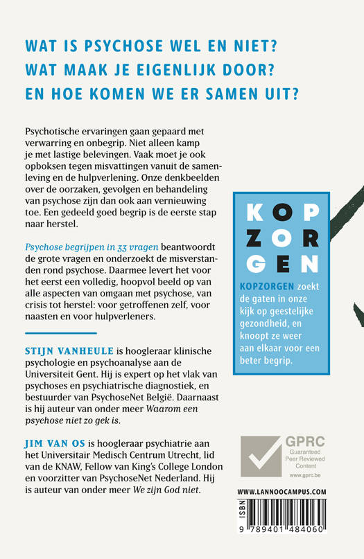 WAT IS PSYCHOSE WEL EN NIET? WAT MAAK JE EIGENLIJK DOOR? EN HOE KOMEN WE ER SAMEN UIT? Psychotische ervaringen gaan gepaard met verwarring en onbegrip. Niet alleen kamp je met lastige belevingen. Vaak moet je ook opboksen tegen misvattingen vanuit de samenleving en de hulpverlening. Onze denkbeelden over de oorzaken, gevolgen en behandeling van psychose zijn dan ook aan vernieuwing toe. Een gedeeld goed begrip is de eerste stap naar herstel. Psychose begrijpen in 33 vragen beantwoordt de grote vragen en onderzoekt de misverstanden rond psychose. Daarmee levert het voor het eerst een volledig, hoopvol beeld op van alle aspecten van omgaan met psychose, van crisis tot herstel: voor getroffenen zelf, voor naasten en voor hulpverleners.