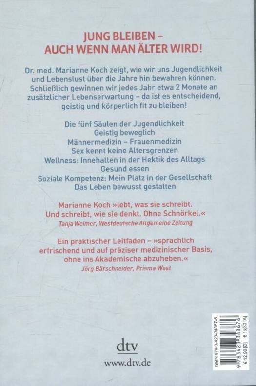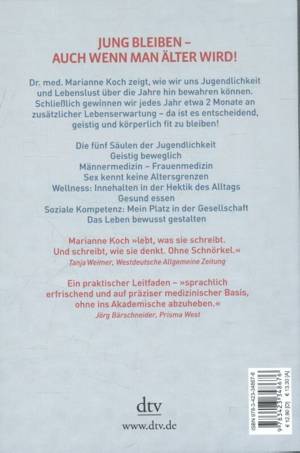 Auf der Basis der neuesten Studien zeigt Marianne Koch in diesem Gesundheitsbuch die vielen Möglichkeiten auf, die wir haben, um jugendlich und geistig fit zu bleiben. Sie hat mit Experten wie mit Prominenten gesprochen und gibt daneben sehr viele praktische Tipps. Mit ihrer sehr persönlichen Erzählweise und ihrer bildhaften Sprache kann sie wie kaum jemand sonst vermitteln, was es bedeutet, »intelligent« zu altern, das heißt, mit Körper, Geist und Seele so klug umzugehen, dass wir Energie und Lebensqualität auch noch im hohen Alter besitzen.