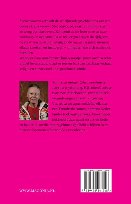 Korsetcadeau verhaalt de schrijnende geschiedenis van een oudere trans vrouw. Met bravoure, vaart en humor kijkt ze terug op haar leven. Zo neemt ze de lezer mee in haar wanhoop en cynisme, als ze tekeer gaat tegen de tijdgeest, de staat van de samenleving en de manier waarop mensen elkaar kwetsen en insnoeren – pijngiften die zich eindeloos herhalen.