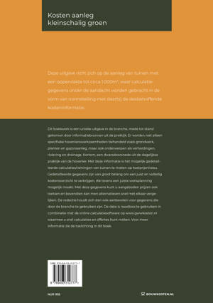 Bij dit boek kan een online-abonnement worden afgenomen. Kosten aanleg kleinschalig groen is uniek in de branche, en is onder andere tot stand gekomen door in formatiebronnen uit de praktijk. Er worden niet alleen specifieke hovenierswerkzaamheden behandeld zoals grondwerk, planten en gazonaanleg, maar ook onderwerpen als verhardingen, riolering en drainage. Kortom, een dwarsdoorsnede uit de dagelijkse praktijk van de hovenier. Met deze informatie is het mogelijk gedetailleerde calculaties/ramingen van tuinen te maken op kostprijsniveau. Gedetailleerde gegevens zijn van groot belang om een juist en volledig kostenoverzicht te verkrijgen, die bovendien een juiste werkplanning mogelijk maakt. Met deze gegevens kunt u aangeboden prijzen ook toetsen en bovendien kan men alternatieven snel met elkaar vergelijken. Jaarlijks worden de prijzen geactualiseerd en wordt de informatie uitgebreid met nieuwe gegevens uit de markt. De redactie houdt zich dan ook aanbevolen voor gegevens die door de branche te gebruiken zijn.