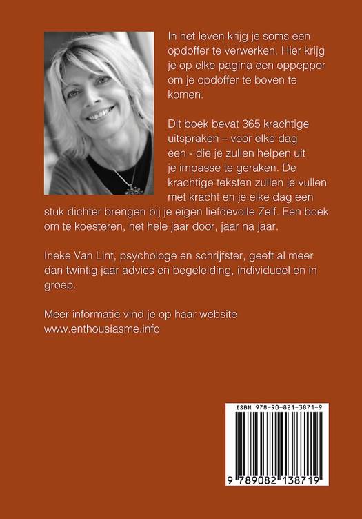 In het leven krijg je soms een opdoffer te verwerken. In dit boek krijg je op elke pagina een oppepper om je opdoffer te boven te komen. Dit boek bevat 365 krachtige uitspraken - voor elke dag één - die je zullen helpen uit je impasse te geraken. De krachtige teksten zullen je vullen met kracht en je elke dag een stuk dichter brengen bij je eigen liefdevolle Zelf. Een boek om te koesteren, het hele jaar door, jaar na jaar.