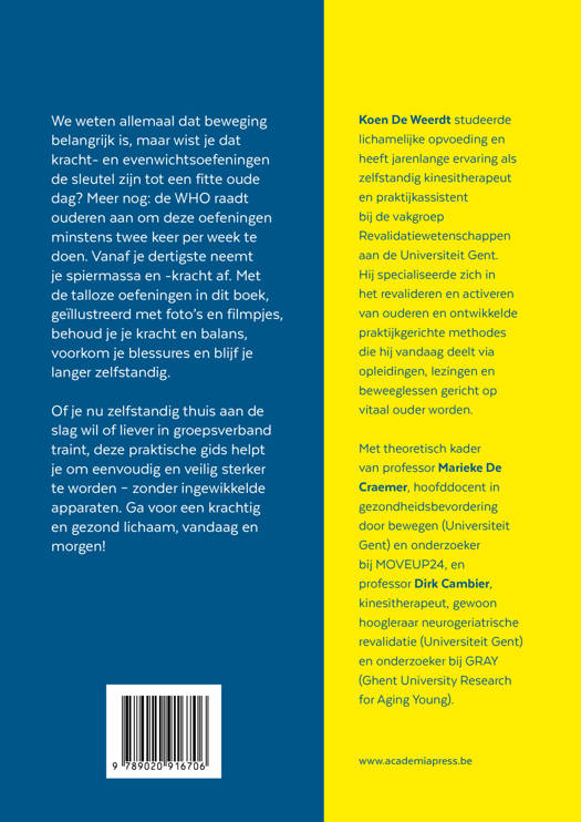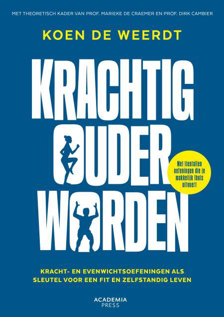 We weten allemaal dat beweging belangrijk is, maar wist je dat kracht- en evenwichtsoefeningen de sleutel zijn tot een fitte oude dag? Meer nog: de WHO raadt ouderen aan om deze oefeningen minstens twee keer per week te doen. Vanaf je dertigste neemt je spiermassa en -kracht af. Met de talloze oefeningen in dit boek, geïllustreerd met foto's en filmpjes, behoud je je kracht en balans, voorkom je blessures en blijf je langer zelfstandig. Of je nu zelfstandig thuis aan de slag wil of liever in groepsverband traint, deze praktische gids helpt je om eenvoudig en veilig sterker te worden – zonder ingewikkelde apparaten. Ga voor een krachtig en gezond lichaam, vandaag en morgen! Met theoretisch kader van professor Marieke De Craemer, hoofddocent in gezondheidsbevordering door bewegen (Universiteit Gent) en onderzoeker bij MOVEUP24, en professor Dirk Cambier, kinesitherapeut, gewoon hoogleraar neurogeriatrische revalidatie (Universiteit Gent) en onderzoeker bij GRAY (Ghent University Research for Aging Young).