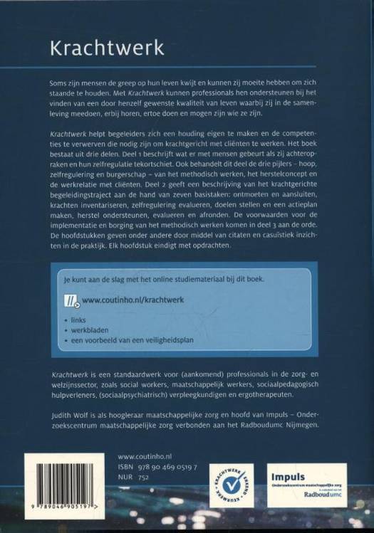 Krachtwerk is een standaardwerk voor studenten die een opleiding voor zorg- of hulpverlener volgen, bijvoorbeeld maatschappelijk werkers, social workers, sociaal-pedagogisch hulpverleners, (sociaal) psychiatrisch verpleegkundigen, rehabilitatiewerkers en ergotherapeuten. Dit boek is ook bedoeld voor professionals en ervaringsdeskundigen. Het biedt concrete handvatten om methodisch te werken aan participatie en zelfregie. Krachtwerk is opgenomen in de databank Effectieve Sociale interventies (Movisie) met de erkenning 'goed onderbouwd'.