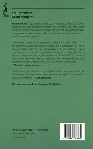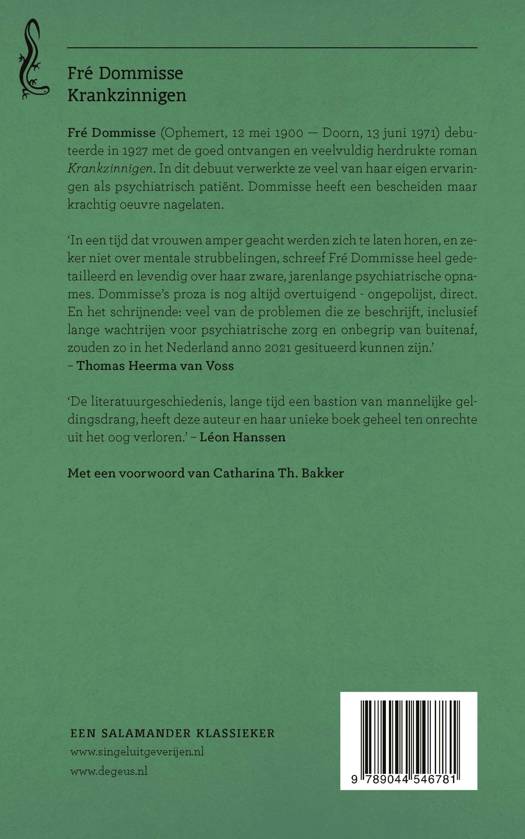 ‘Geen groter misverstand dan Krankzinnigen te begrijpen als het ziektegeval van een voormalig psychiatrisch patiënt. Als Fré Dommisse met deze titel in 1929 haar debuut maakt, levert ze meteen een literaire prestatie van bijzonder formaat. De uiterlijke omstandigheden die Dommisse zo aangrijpend schetst behoren misschien tot de wereld van gisteren, maar de manier waarop ze de lezer weet te verstrengelen met het innerlijk lot van de ik-figuur, een vrouw, een dochter, een mens, maakt van Krankzinnigen een werk voor alle tijden.’ – Léon Hanssen