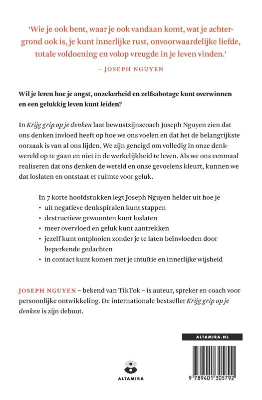 In 'Krijg grip op je denken' laat Joseph Nguyen zien hoe we geneigd zijn om te verdwalen in ons denken, waardoor we in een negatieve spiraal terechtkomen. Door ons bewust te worden van het feit dat ons denken directe invloed heeft op onze mentale gezondheid, leren we er minder aandacht aan te besteden. Zo bereiken we een staat van niet-denken, waardoor je eindelijk uit die stroom van negatief denken ontsnapt. Dankzij de wijsheid van dit boek ontdek je de oneindige mogelijkheden van je geest, zodat je elk gewenst leven kunt creëren en manifesteren, ongeacht je omstandigheden.