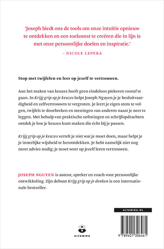 Aan het maken van keuzes hoeft geen eindeloos piekeren vooraf te gaan. In Krijg grip op je keuzes helpt Joseph Nguyen je je besluitvaardigheid en zelfvertrouwen te vergroten. Je leert je eigen stem te volgen, twijfels te doorbreken en meningen van anderen naast je neer te leggen. Met behulp van praktische oefeningen en schrijfopdrachten ontdek je hoe je keuzes kunt maken die écht bij je passen.