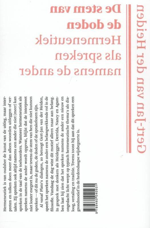 Hermeneutiek is van oudsher de kunst van het uitleggen, maar interpreten en vertalers doen meer dan alleen woorden verhelderen. Wanneer hermeneutiek wordt opgevat als spreken namens de ander, blijkt de interpreet tevens de stem te zijn van hen die afwezig zijn of de taal van de toehoorders niet machtig zijn - of dit nu de goden, de doden of de sprakelozen zijn. Al vanaf Plato's dialogen, zo betoogt Gert-Jan van der Heiden, speelt het spreken namens de ander een belangwekkende rol in de filosofie. Tegenwoordig wint dit motief alleen maar aan belang. In gesprek met denkers als Heidegger, Derrida, Nancy en Agamben laat Van der Heiden zien dat het spreken namens de ander een nieuw en ongedacht licht werpt op typisch hermeneutische thema's als dialoog, vertaling en traditie. Ook toont hij aan dat dit spreken een grondmotief is in de hedendaagse wijsbegeerte.
