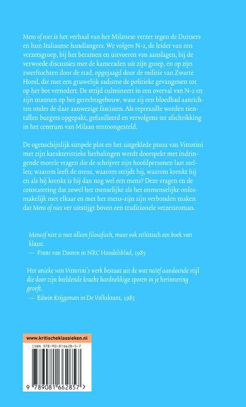 In 1943 lijkt er een einde te komen aan de in 1922 door Mussolini gevestigde fascistische dictatuur in Italië. Nadat de geallieerden in juli 1943 op Sicilië waren geland, wordt vooral in het noorden van Italië het verzet steeds sterker. De ontwikkelingen volgen elkaar snel op: eerst wordt Mussolini door zijn eigen fascistische partij afgezet en gevangengenomen, vervolgens zoekt de Italiaanse koning toenadering tot de geallieerden en vallen de Duitse troepen het noorden van Italië binnen. Ze bevrijden Mussolini uit de gevangenis en dringen hem de leiding op van de nieuwe Italiaanse Sociale Republiek, niet meer of minder dan een vazalstaat van Duitsland. In het voorjaar van 1945 komt er een eind aan deze 'Republiek van Salò' het verzet van de partizanen wordt steeds sterker en de geallieerden rammelen aan de poort. Eind april 1945 capituleren de Duitse legers in Italië. Al in juni 1945 ligt Elio Vittorini's roman "Mens of niet" in de boekhandel. Het is daarmee met recht de eerste literaire verwerking van het verzet tegen het fascisme. Voor hij deze roman kon schrijven had Vittorini een lange weg te gaan. Zoals zoveel jonge Italianen voelt hij zich aanvankelijk aangetrokken tot het anti-burgerlijke, revolutionaire en 'moderne' fascisme, maar als schrijver en journalist blijft hij open staan voor alles wat dynamisch en vernieuwend is. Dat brengt hem steeds vaker in conflict met de fascistische autoriteiten. De breuk volgt na het uitbreken van de Spaanse Burgeroorlog, als hij partij kiest voor de Republikeinen en tegen Franco. Vittorini sluit zich aan bij het communistische verzet, wordt in 1943 gearresteerd, vier weken later op borgtocht vrijgelaten en moet vervolgens onderduiken. Vanuit zijn onderduikadres geeft hij de Milanese editie van de illegale communistische krant L’Unita uit en begint hij te schrijven aan "Mens of niet". "Mens of niet" is het verhaal van het Milanese verzet tegen de Duitsers en hun Italiaanse handlangers