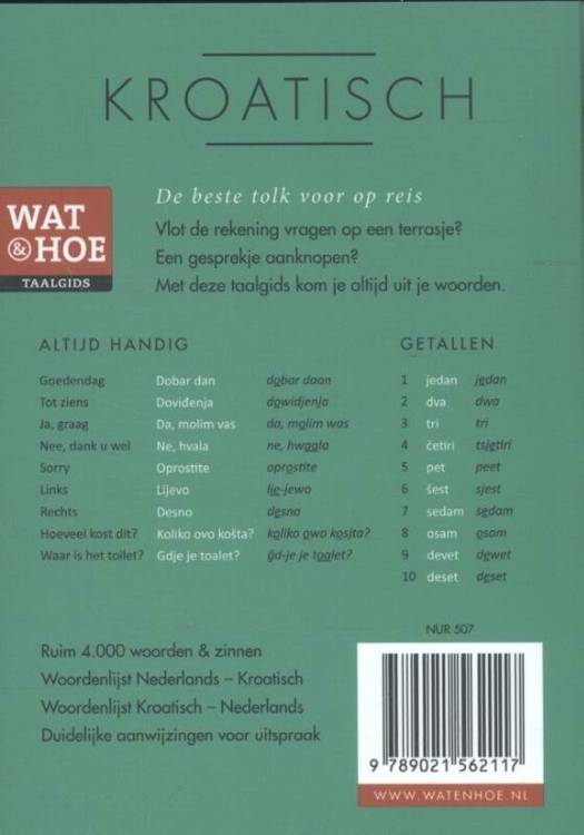 Wat & Hoe Taalgids Kroatisch is de beste tolk voor op reis. Met ruim 4.000 woorden en zinnen kom je altijd uit je woorden. Vlot de rekening vragen? Een gesprekje aanknopen? Met deze taalgids lukt het allemaal. Ook kun je met deze gids eigen zinnen maken met behulp van de woordenlijst achterin. In veel hoofdstukken is een alfabetische lijst van termen opgenomen inclusief duidelijke aanwijzingen voor uitspraak. Bovendien kun je deze gids ook gebruiken als een eerste hulpmiddel bij het leren van de taal.