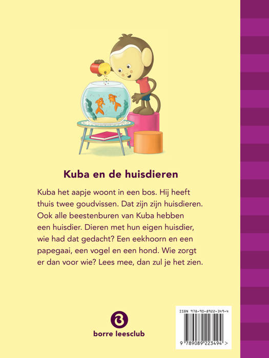 [Vanaf 3 jaar] Kuba het aapje woont in een bos. Hij heeft thuis twee goudvissen. Dat zijn zijn huisdieren. Ook alle beestenburen van Kuba hebben een huisdier. Dieren met hun eigen huisdier, wie had dat gedacht? Een eekhoorn en een papegaai, een vogel en een hond. Wie zorgt er dan voor wie? Lees mee, dan zul je het zien.