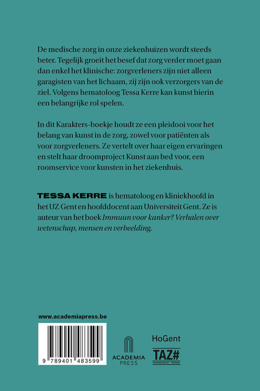 De medische zorg in onze ziekenhuizen wordt steeds beter. Tegelijk groeit het besef dat zorg verder moet gaan dan enkel het klinische: zorgverleners zijn niet alleen garagisten van het lichaam, zij zijn ook verzorgers van de ziel. Volgens hematoloog Tessa Kerre kan kunst hierin een belangrijke rol spelen.
