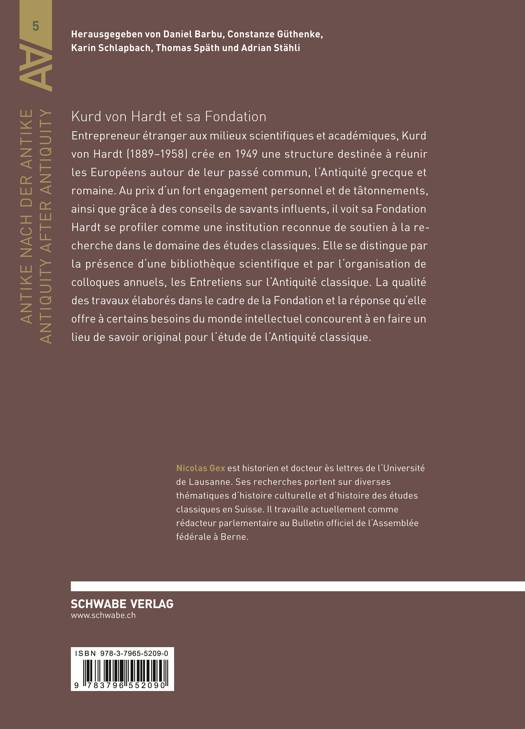 Entrepreneur etranger aux milieux scientifiques et academiques, Kurd von Hardt (1889-1958) cree en 1949 une structure destinee a reunir les Europeens autour de leur passe commun, l'Antiquite. Au prix d'un fort engagement personnel et de tatonnements, ainsi que grace a des conseils de savants influents, il voit sa Fondation Hardt se profiler comme une institution reconnue de soutien a la recherche dans le domaine des etudes classiques. Elle se distingue par la presence d'une bibliotheque scientifique et par l'organisation de colloques annuels, les Entretiens sur l'Antiquite classique. La qualite des travaux elabores dans le cadre de la Fondation et la reponse qu'elle offre a certains besoins du monde intellectuel concourent a en faire un lieu de savoir original pour l'etude de l'Antiquite.