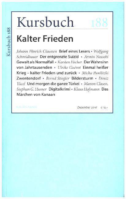 Wenn ein kalter Krieg einem heißen Krieg allemal vorzuziehen ist, gilt Gleiches auch übertragen auf den Frieden? Das heißt: Ist auch ein "kalter Frieden", kalkuliert und stets im Horizont drohender Gewalt, einem heißen Frieden, also einem, der auf starken Gefühlen und einem Höchstmaß an Interessenausgleich und Stabilität basiert, vorzuziehen? Was einen kalten Frieden ausmacht und ob und welche Alternative es zu ihm gibt, damit setzen sich die Beiträge des neuen Kursbuches auseinander. Zum Beispiel mit der Frage, ob Europa tatsächlich vor einem lang schon prognostizierten Bürgerkrieg aller gegen alle steht oder nicht doch in der Lage ist, den wirklichen Frieden zu realisieren, und ob vielleicht nicht sogar beides nur zwei Seiten einer Medaille sind. Ein Maximum an Stabilität und Kalkulierbarkeit ist womöglich mit einem Maximum an Versöhnung gar nicht zu haben. Denn wo ein kalter Frieden sich damit zufrieden gibt, dass die zivilisatorische Eisdecke hält, muss ein heißer Frieden so entschieden kompromisslos verteidigt werden, wie er begründet wird. Soweit es also um eine Frage der Temperamente geht, zielt das, was im Kursbuch 188 diskutiert wird, insgesamt auf ein angemessenes Maß an eher kühlem Temperament ab. Mit Beiträgen von Wolfgang Schmidbauer, Karsten Fischer, Ulrike Guérot, Micha Pawlitzki, Bernd Stiegler, Deniz Yücel, Manon Clasen, Stephan G. Humer, Klaus Hofmann, Johann Hinrich Claussen und Armin Nassehi.