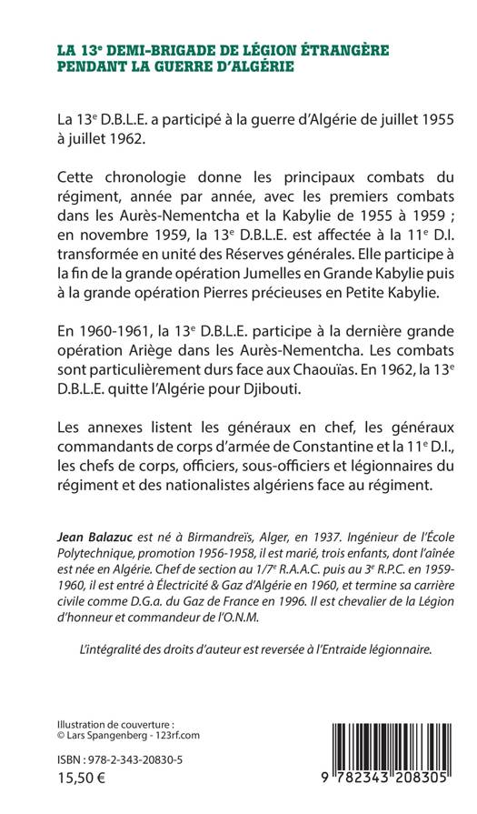 La 13e D.B.L.E. a participé à la guerre d'Algérie de juillet 1955 à juillet 1962. Cette chronologie donne les principaux combats du régiment, année par année, avec les premiers combats dans les Aurès-Nementcha et la Kabylie de 1955 à 1959 ; en novembre 1959, la 13e D.B.L.E. est affectée à la 11e D.I. transformée en unité des Réserves générales. Elle participe à la fin de la grande opération Jumelles en Grande Kabylie puis à la grande opération Pierres précieuses en Petite Kabylie. En 1960-1961, la 13e D.B.L.E. participe à la dernière grande opération Ariège dans les Aurès-Nementcha. En 1962, la 13e D.B.L.E. quitte l'Algérie pour Djibouti.