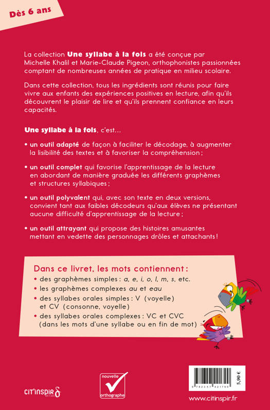 Des textes adaptés pour lire plus facilement ! Pour faciliter l’apprentissage de la lecture, les mots qui composent les histoires ont été sélectionnés en fonction de leur familiarité, de leur structure syllabique et des graphèmes* qu’ils contiennent. Plusieurs adaptations visuelles permettent de réduire la charge cognitive liée au décodage et de limiter l’encombrement perceptif. Les livrets contiennent deux fois la même histoire : dans la première version, syllabes orales, lettres muettes et graphèmes complexes sont mis en relief ; dans la seconde, ces adaptations ne sont pas présentes. Ce sont donc des outils polyvalents qui favorisent le transfert des acquis et qui conviennent à tous les enfants. Les histoires fantaisistes mettent en scène des personnages rigolos et attachants. La trame narrative captive les jeunes lecteurs tout en leur permettant de faire des prédictions. Les illustrations leur donnent aussi de nombreuses occasions de faire des inférences.