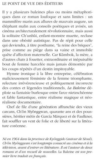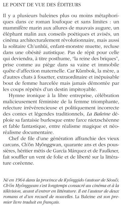 « La baleine », c'est Chunhui, une muette d'une corpulence extraordinaire, quasiment abandonnée par sa mère Kumbok, trop occupée à séduire et à gagner de l'argent. Il y a aussi une grand-mère, misérable, qui n'a pas de lien de famille avec elles, mais dont elles récupéreront la fortune cachée dans le faux plafond. Kumbok mène une vie d'aventures, qui l'amènera à construire une ville (qu'un incendie détruira) et à changer de sexe. Sa fille, la reine des briques, assez simplette, passera sa vie entre l'usine où elle fabriquera seule les meilleures briques du pays, et la prison où la conduira son incapacité à s'exprimer pour se disculper, tout en communiquant avec un éléphant. Tout est prétexte à un défilé de personnages picaresques et à des aventures burlesques. Scénariste à succès, Ch‘on Myonggwan appartient à la génération des écrivains quadragénaires qui n'a pas connu la Guerre de Corée, et qui n'a donc jamais connu non plus son pays unifié. Il est naturel qu'il se tourne vers des thèmes qui, contrairement à ceux de ses aînés, s'éloignent de l'histoire et de ses drames, s'affranchissant ainsi des figures imposées et d'une certaine tendance tragico-sentimentaliste, s'autorisant à prendre la réalité de façon bien plus libre et lançant de multiples passerelles avec les pratiques culturelles de leur jeune lectorat, à commencer par le cinéma et la télévision. Mais ils le font en véritables écrivains, sans abdiquer les moyens spécifiques de la littérature. Celui que Ch'on privilégie est l'outrance, en particulier par l'humour. Le récit fantastique (qu'importe que les personnages soient vivants ou morts) saute d'un personnage à l'autre au gré de la plume sarcastique et comique de l'auteur, qui mêle avec un plaisir évident tous les genres littéraires ? roman réaliste, puis fantastique, puis picaresque, scénario, conte pour enfant, légendes, récit érotique. On a beaucoup évoqué Gabriel Garcia Marquez au sujet de Ch'on Myonggwan, ce qu'il faut prendre comme une information sur la façon de lire coréenne. Cette comparaison est fondée, toutes proportions gardées : par son écriture et par le foisonnement des situations, mais aussi par la complexité du récit. En fait, c'est aussi à Faulkner qu'il fait penser, si l'on ajoute la façon dont ses personnages sont ancrés dans une terre difficile qui les définit et leur impose ses difficultés. On peut aussi penser au caractère énhaurme de la comédie italienne.