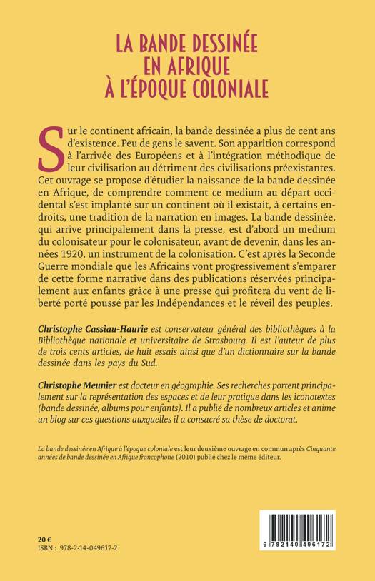 Sur le continent africain, la bande dessinée a plus de cent ans D'existence. Peu de gens le savent. Son apparition correspond à l'arrivée des européens et à l'intégration méthodique de leur civilisation au détriment des civilisations préexistantes. Cet ouvrage se propose d'étudier la naissance de la bande dessinée en Afrique, de comprendre comment ce medium au départ occidental s'est implanté sur un continent où il existait, à certains endroits, une tradition de la narration en images. La bande dessinée, qui arrive principalement dans la presse, est d'abord un medium du colonisateur pour le colonisateur, avant de devenir, dans les années 1920, un instrument de la colonisation. C'est après la seconde Guerre mondiale que les africains vont progressivement s'emparer de cette forme narrative dans des publications réservées principalement aux enfants grâce à une presse qui profitera du vent de liberté porté poussé par les indépendances et le réveil des peuples.