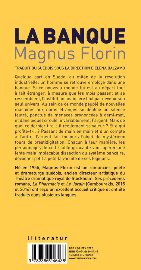 Né en 1955, Magnus Florin est un romancier, poète et dramaturge suédois, ancien directeur artistique du Théâtre dramatique royal de Stockholm. Ses précédents romans, "La Pharmacie" et "Le Jardin" (Cambourakis,2015 et 2016) ont reçu un excellent accueil critique et ont été traduits dans plusieurs langues.