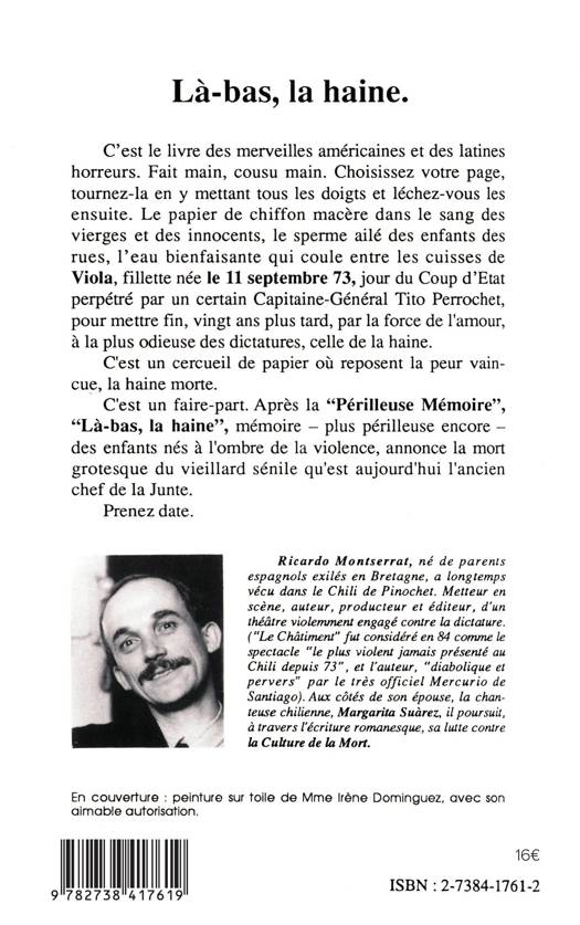 C'est le livre des merveilles américaines et des latines horreurs. Fait main, cousu main. Choisissez votre page, tournez-la en y mettant tous les doigts et léchez-vous les ensuite. Le papier de chiffon macère dans le sang des vierges et des innocents, le sperme ailé des enfants des rues, l'eau bienfaisante qui coule entre les cuisses de Viola, fillette née le 11 septembre 73, jour du Coup d'Etat perpétré par un certain Capitaine-Général Tito Perrochet, pour mettre fin, vingt ans plus tard, par la force de l'amour, à la plus odieuse des dictatures, celle de la haine. C'est un cercueil de papier où reposent la peur vaincu?, la haine morte. C'est un faire-part. Après la "Périlleuse Mémoire", "Là-bas, la haine", mémoire -plus périlleuse encore - des enfants nés à l'ombre de la violence, annonce la mort grotesque du vieillard sénile qu'est aujourd'hui l'ancien chef de la Junte.