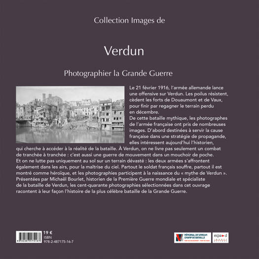 « Le 21 février 1916, l'armée allemande lance une offensive sur Verdun. Les poilus résistent, cèdent les forts de Douaumont et de Vaux, pour finir par regagner le terrain perdu en décembre. De cette bataille mythique, les photographes de l'armée française ont pris de nombreuses images. D'abord destinées à servir la cause française dans une stratégie de propagande, elles intéressent aujourd'hui l'historien, qui cherche à accéder à la réalité de la bataille. À Verdun, on ne livre pas seulement un combat de tranchée à tranchée : c'est aussi une guerre de mouvement dans un mouchoir de poche. Et on ne lutte pas uniquement au sol sur un terrain dévasté : les deux armées s'affrontent également dans les airs, pour la maîtrise du ciel. Partout le soldat français souffre, partout il est montré comme héroïque, et les photographies participent à la naissance du « mythe de Verdun ». Présentées par Michaël Bourlet, historien de la Première Guerre mondiale et spécialiste de la bataille de Verdun, les cent-quarante photographies sélectionnées dans cet ouvrage racontent à leur façon l'histoire de la plus célèbre bataille de la Grande Guerre. »