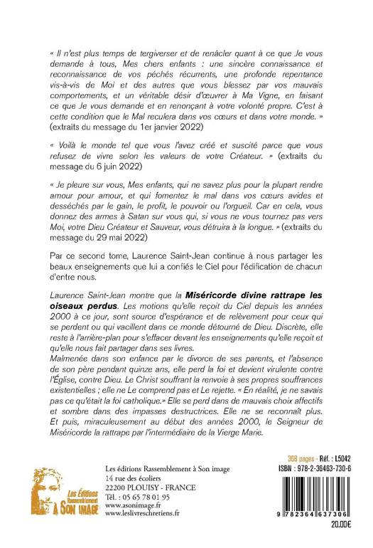 Laurence Saint-Jean montre que la Miséricorde divine rattrape les oiseaux perdus. Les motions qu'elle reçoit du Ciel depuis les années 2000 à ce jour, sont source d'espérance et de relèvement pour ceux qui se perdent ou qui vacillent dans ce monde détourné de Dieu. Discrète, elle reste à l'arrière-plan pour s'effacer devant les enseignements qu'elle reçoit et qu'elle nous partage dans ses livres. Malmenée dans son enfance par le divorce de ses parents, et l'absence de son père pendant quinze ans, elle perd la foi et devient virulente contre l'Église, contre Dieu. Le Christ souffrant la renvoie à ses propres souffrances existentielles , elle ne Le comprend pas et Le rejette. En réalité, je ne savais pas ce qu'était la foi catholique. Elle se perd dans de mauvais choix affectifs et sombre dans des impasses destructrices. Elle ne se reconnaît plus. Et puis, miraculeusement au début des années 2000, le Seigneur de Miséricorde la rattrape par l'intermédiaire de la Vierge Marie...