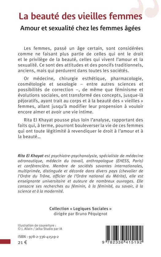 Les femmes, passé un âge certain, sont considérées comme ne faisant plus partie de celles qui ont le droit et le privilège de la beauté, celles qui vivent l’amour et la sexualité. Ce sont des attitudes et des poncifs traditionnels, anciens, mais qui perdurent dans toutes les sociétés. Or médecine, chirurgie esthétique, pharmacologie, cosmétologie et sexologie – entre autres sciences et possibilités de correction –, de même que féminisme et évolutions sociales, ont transformé des concepts, jusque-là péjoratifs, ayant trait au corps et à la beauté des « vieilles » femmes, allant jusqu’à modifier leur propension à vouloir encore aimer et avoir une vie intime. Rita El Khayat pousse plus loin l’analyse, rapportant des faits qui, à terme, pourront bouleverser la vie de ces femmes qui ont toute légitimité à revendiquer le droit à l’amour et à la beauté…